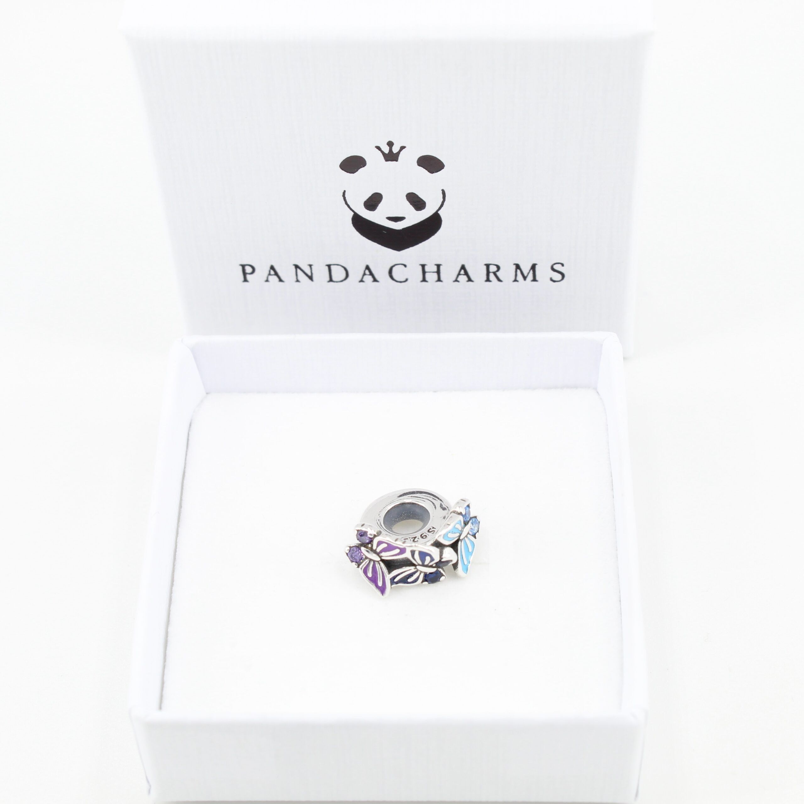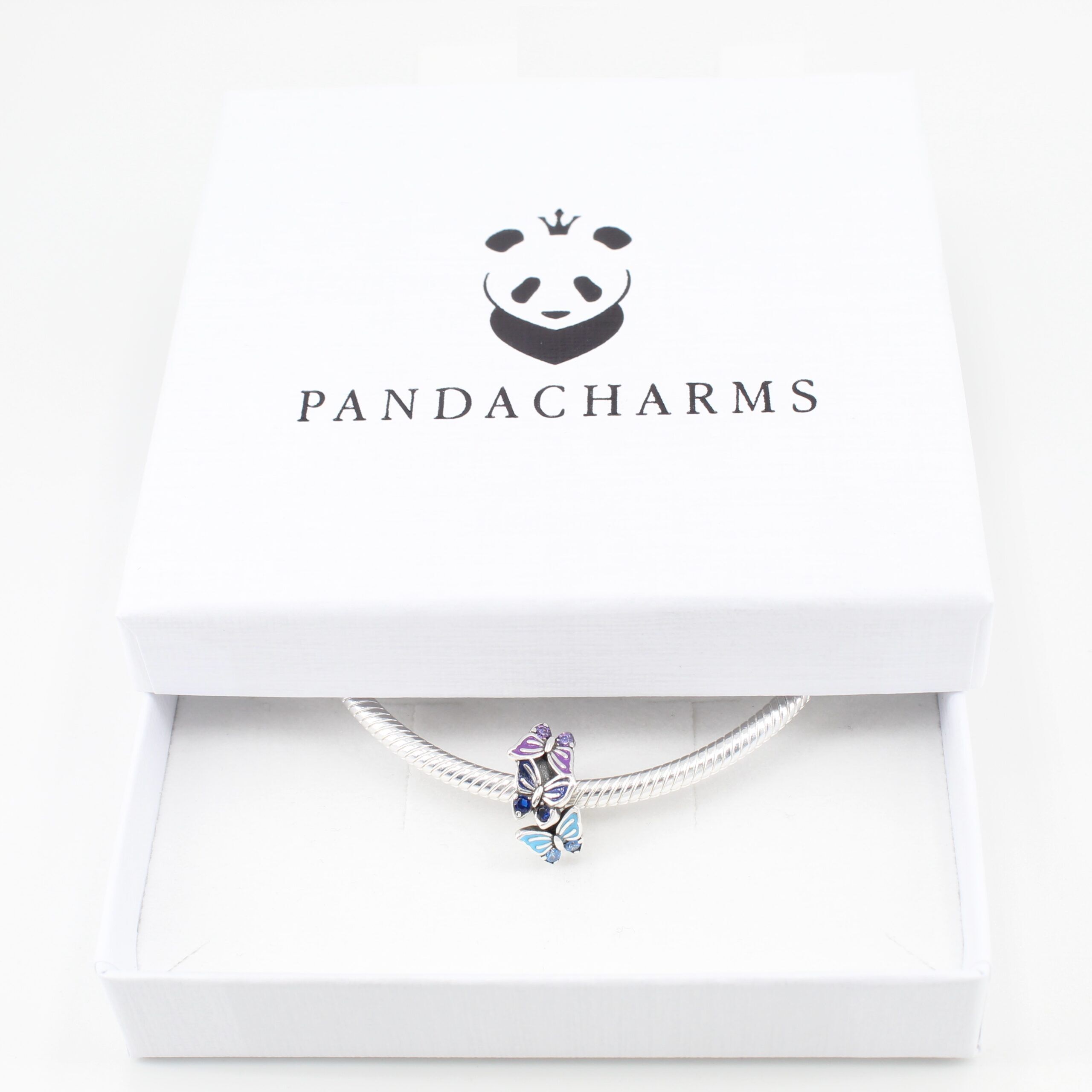 Das Zwischenelement ist außen mit drei kleinen Schmetterlingen in der Farben dunkelblau, lila und türkis besetzt, sie sind verziert mit bunten Zirkonia Steinen. Innen ist der Bunte Schmetterlinge Zwischenelement Stopper Charm mit einen Silikonkern versehen, so dass er als Stopper mit etwas Kraft auf Armbänder mit Gewinde aufgedreht werden muss. Der Silikonring sorgt dafür, dass das Zwischenelement auf dem Armband nicht verrutscht und hält die anderen Charms so an Ort und Stelle.