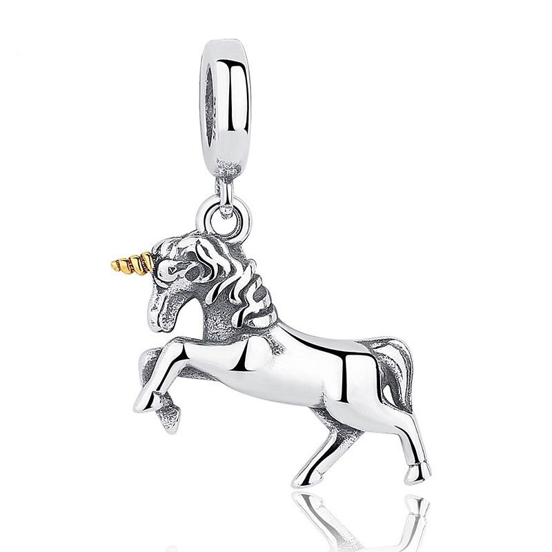 Unser Einhorn Charm Anhänger ist als wunderbar detailliertes Pferd mit einem lang gedrehten, vergoldeten Horn gearbeitet. In der Antike wurden Einhörner unter anderem schon von Aristoteles und Plinius dem Älteren beschrieben. Mit dem Sibirischen Einhorn, das bis vor ca. 39.000 Jahren lebte, gab es sogar echte Einhörner, deren Fossilien auch untersucht werden konnten. Man vermutet, dass das veränderte Klima zu seinem Aussterben geführt haben könnte. Einhörner gelten heute als die edelsten aller Fabeltiere und stehen als Symbol für das Gute. Trage es an Deinem Armband zur Zierde und als Glücksbringer!