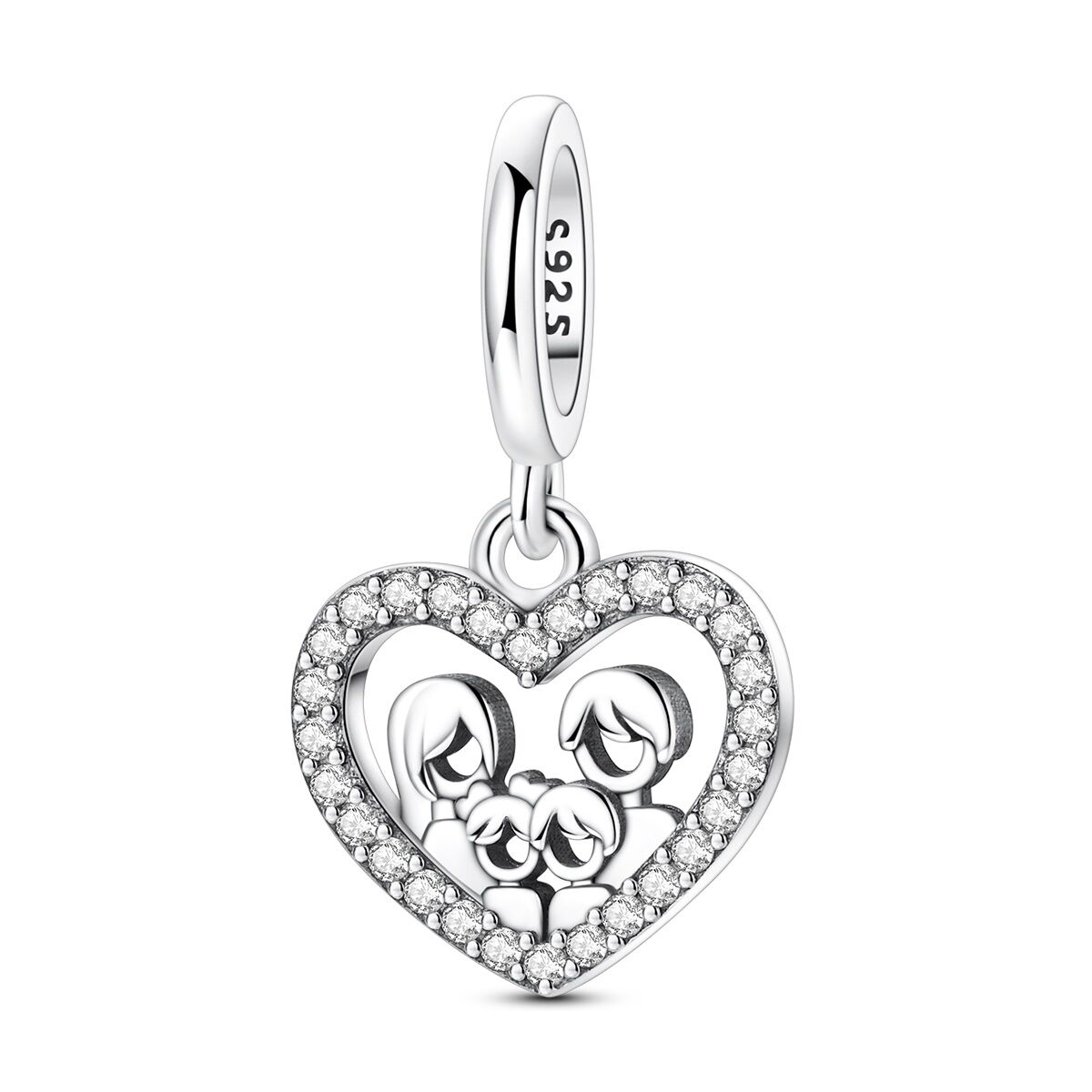 Die Familie in einem mit funkelnden Zirkonia Steinen besetzten Herz. Der Familienglück Herz Charm Anhänger zeigt Deine Liebe zu Deiner Familie und lässt sie mit dem Anhänger immer bei Dir sein. Schlicht und elegant passt der Anhänger gut zu anderen Charms und Anhängern in Silber und mit weißen Steinen und ist eine Zierde für jedes Charm Armband.