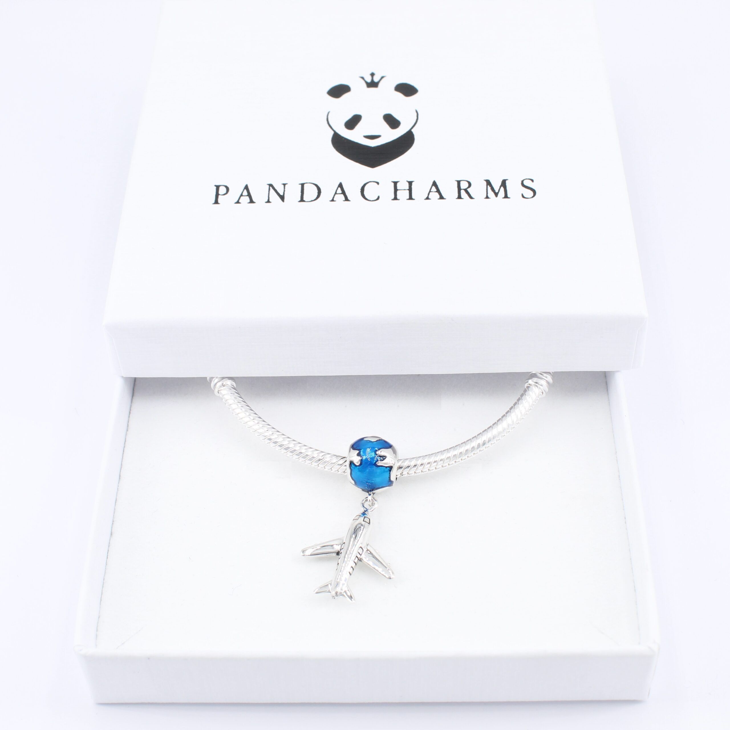 Ein poliertes, vierstrahliges Flugzeug an einer stilisierten und aufwändig mit blau emaillierten Weltkugel. Reinsetzen, wohlfühlen, losfliegen, einmal ans andere Ende der Welt und zurück. Der Flugzeug mit Weltkugel Charm Anhänger ist für alle, die die Ferne lieben!