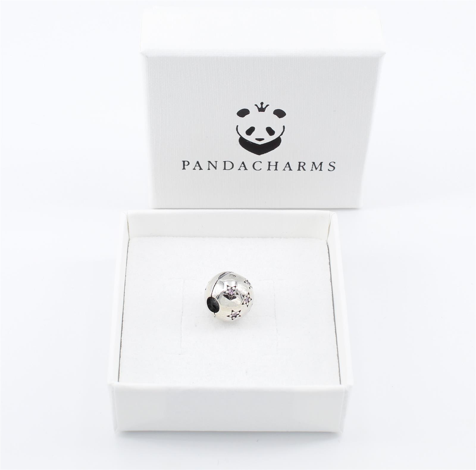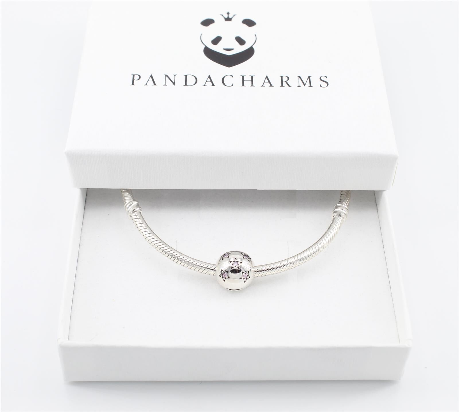 Ein runder, glänzender Clip mit vielen rosa Steinen, eingefasst in Sternformen. Veredelt jedes Armband, die poliert glänzende Oberfläche setzt eindrucksvolle Akzente, besonders wenn zwei Stück auf den Gewinden den Rest der Charms einrahmen.