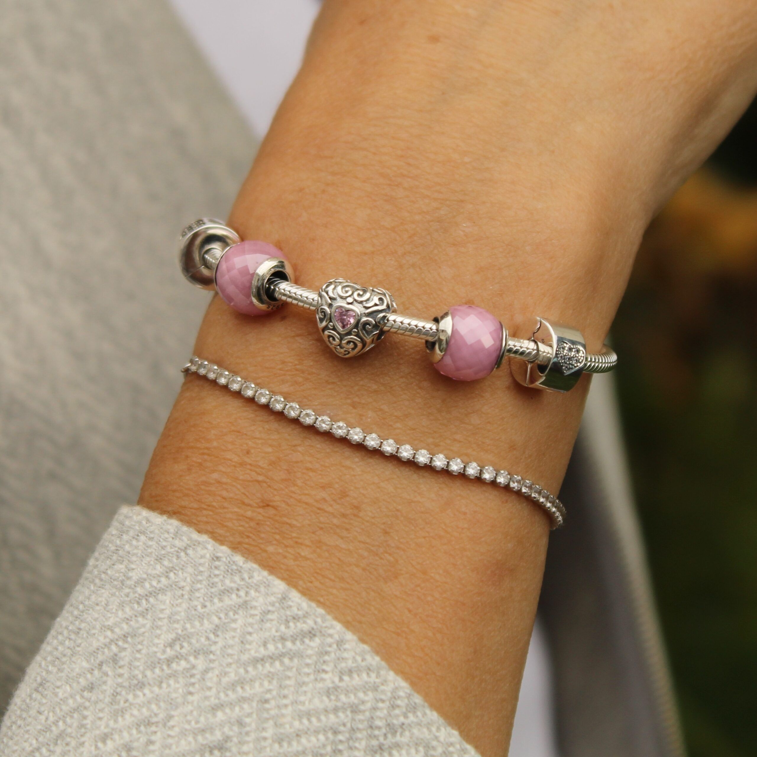 Tennisarmbänder lassen sich nicht nur alleine, sondern auch wunderbar zusammen mit anderen Armbändern in Kombination, beispielsweise mit Charm Armbändern von uns und Pandora, tragen.