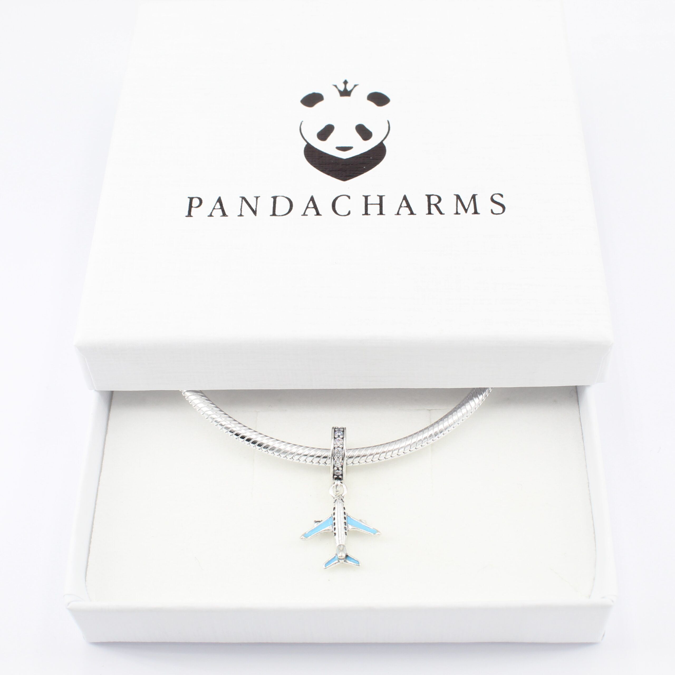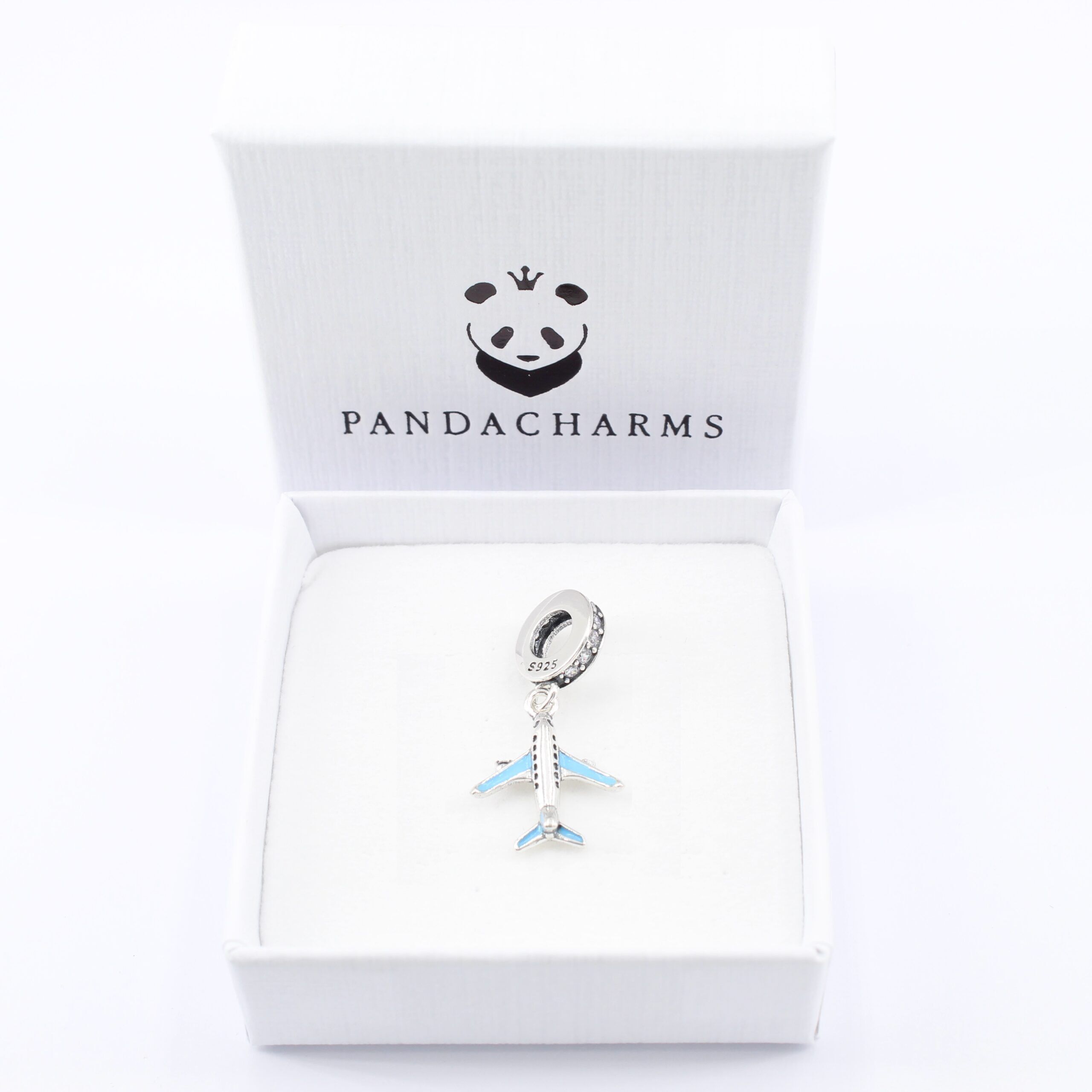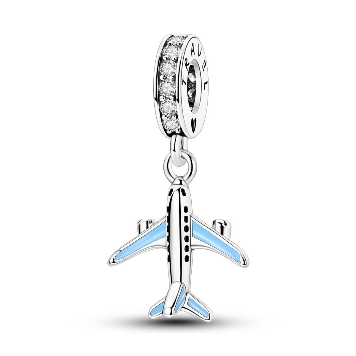 Ein zweistrahliges Flugzeug mit hellblauen Tragflächen an einem rundum mit Zirkonia Steinen verzierten Ring. Auf dem Ring ist seitlich das Wort TRAVEL und ein kleines Herz graviert. So ist der Hellblaues Flugzeug Charm Anhänger perfekt für alle, die gerne Reisen und passt zu weiteren Motiven rund ums Reisen oder in Hellblau.