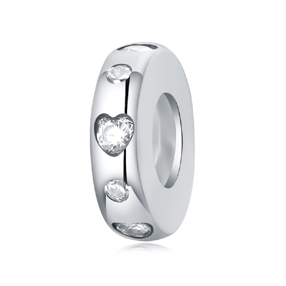Ein Zwischenelement rundum verziert mit kleinen weißen Zirkonia Steinen, rund und in Herzform. Innen ist das Herzen und Steine Stopper Zwischenelement mit einen Silikonkern versehen, so dass er als Stopper mit etwas Kraft auf Armbänder mit Gewinde aufgedreht werden muss. Der Silikonring sorgt dafür, dass das Zwischenelement auf dem Armband nicht verrutscht und hält die anderen Charms so an Ort und Stelle.