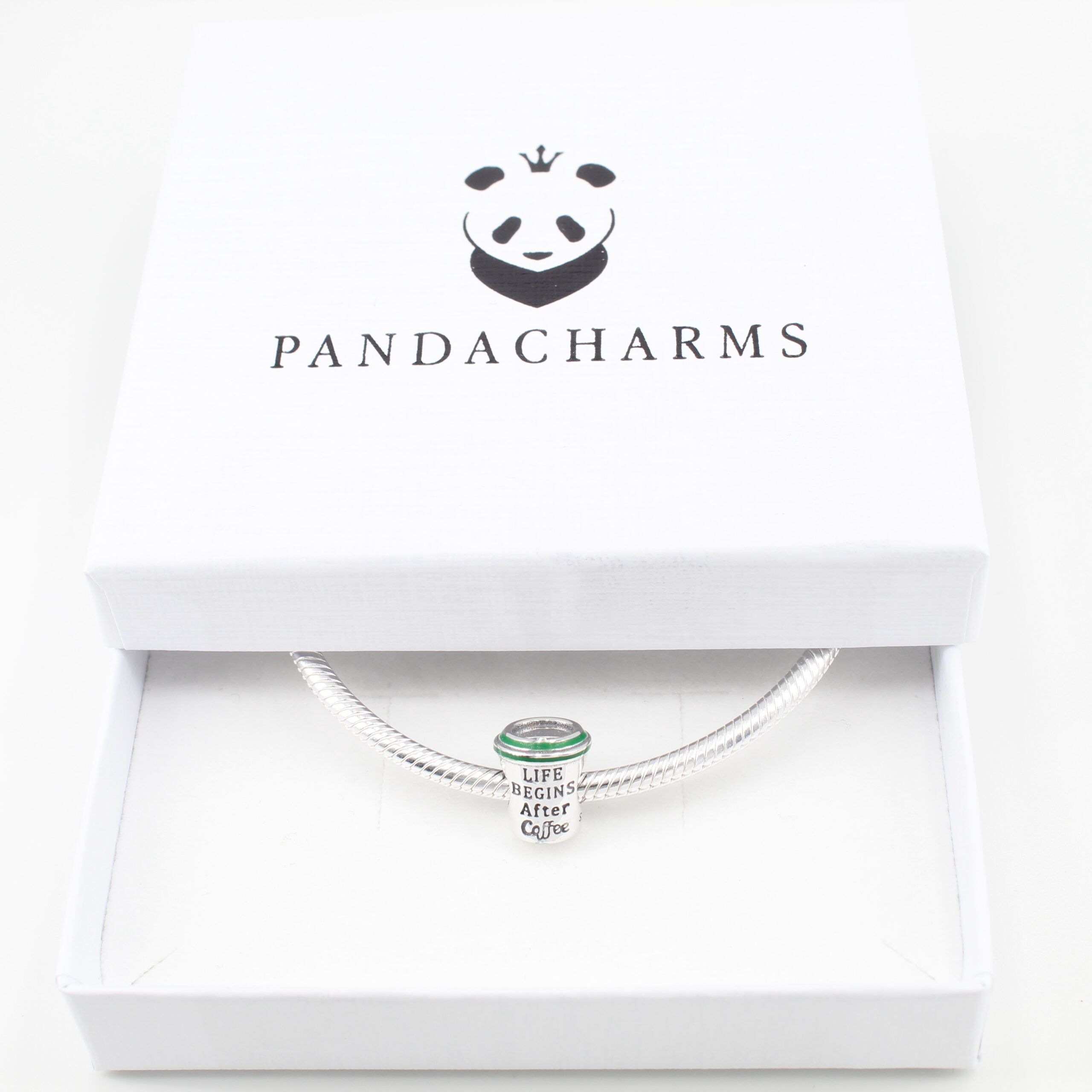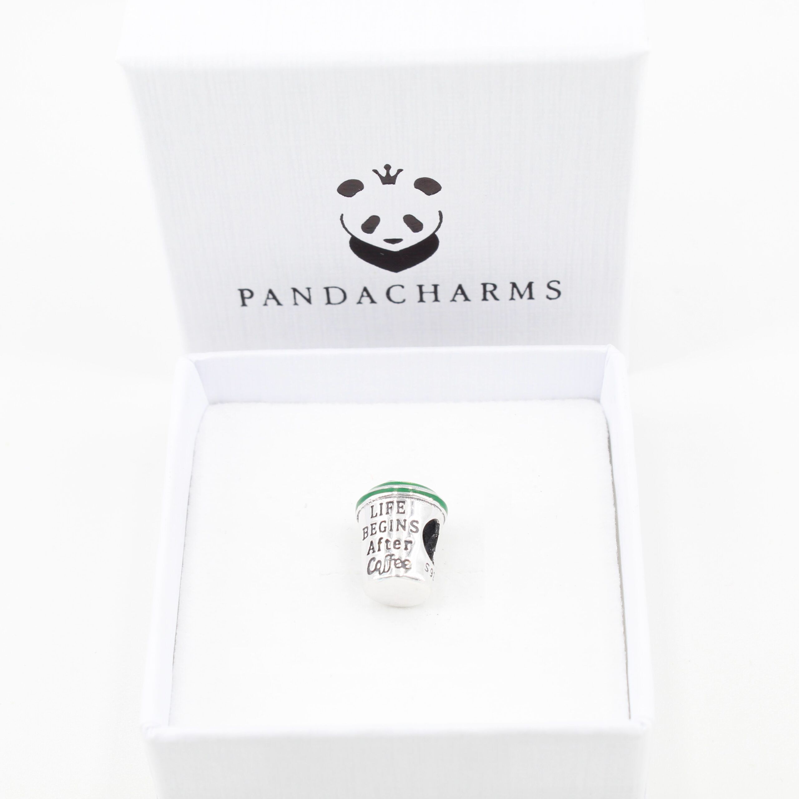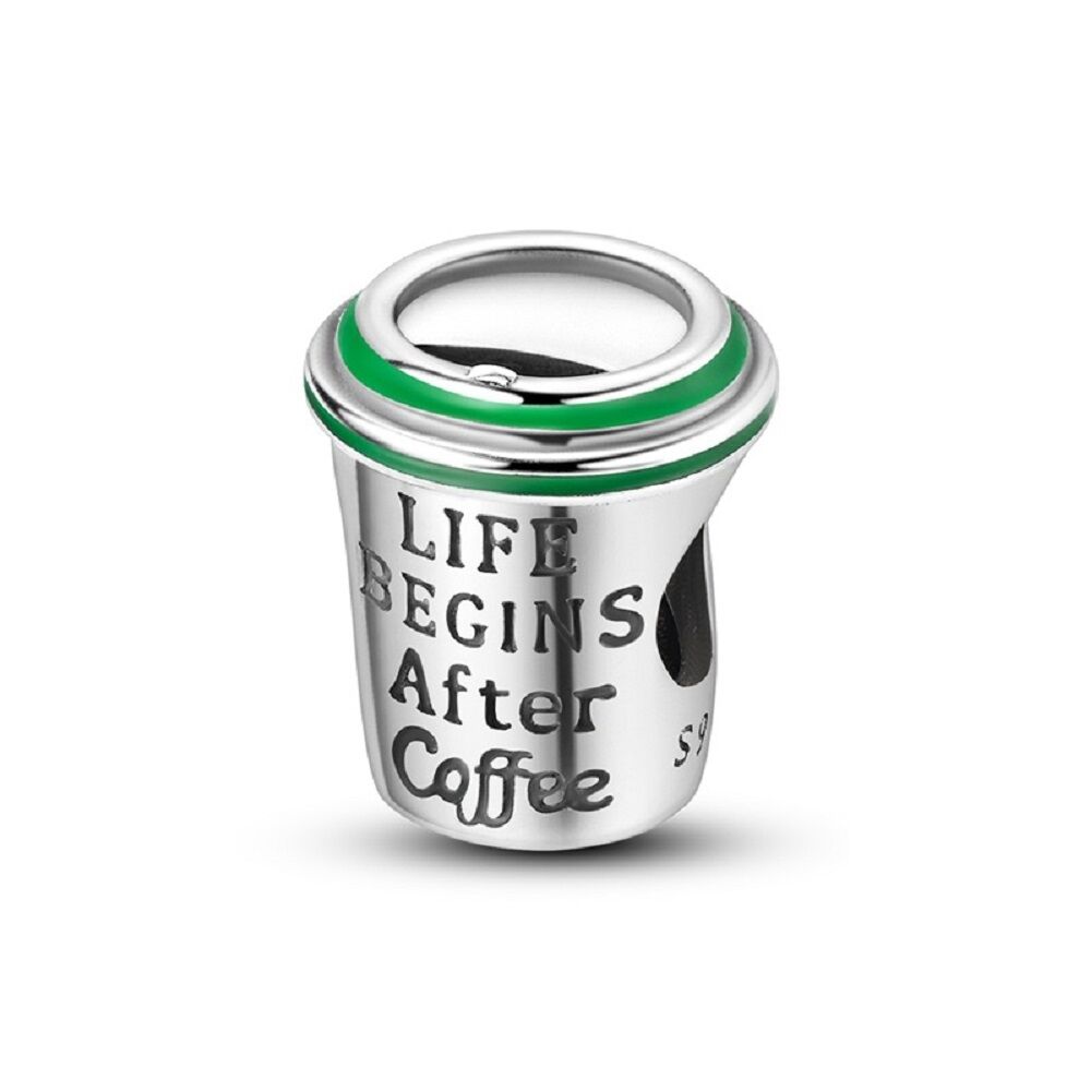 Der Kaffeebecher Charm aus 925er Sterling Silber ist auf der einen Seite versehen mit den Worten „Life Begins After Coffee“, auf der anderen Seite sind drei grüne Herzen. Die grüne Farbe ist der von Starbucks ähnlich, der Charm ist ein MUSS für alle Kaffee Liebhaber und soll Dir immer Enegrie verleihen!