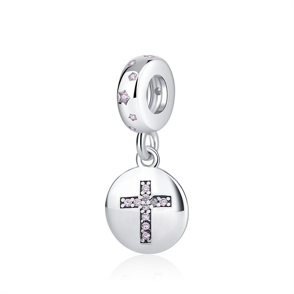 Das klassische, lateinische Kreuz ist auf diesem runden, glänzend polierten Anhänger auf beiden Seiten gleichermaßen mit einer Vielzahl aus rosa Zirkonia Steinen eingelassen. Schon in der Frühzeit der Menschheit war das Kreuz ein Kultgegenstand, wie man aus archäologischen Funden weiß. Die Verwendung des Kreuzes geht zurück bis in die Steinzeit. Im Christentum symbolisiert der vertikale Balken die Beziehung zwischen Gott und den Menschen. So kann der Lateinisches Kreuz mit Rosa Steinen Charm Anhänger an Deinem Armband genau die Bedeutung haben, die Du ihm zumisst und an der Du Dich tagtäglich erfreust!