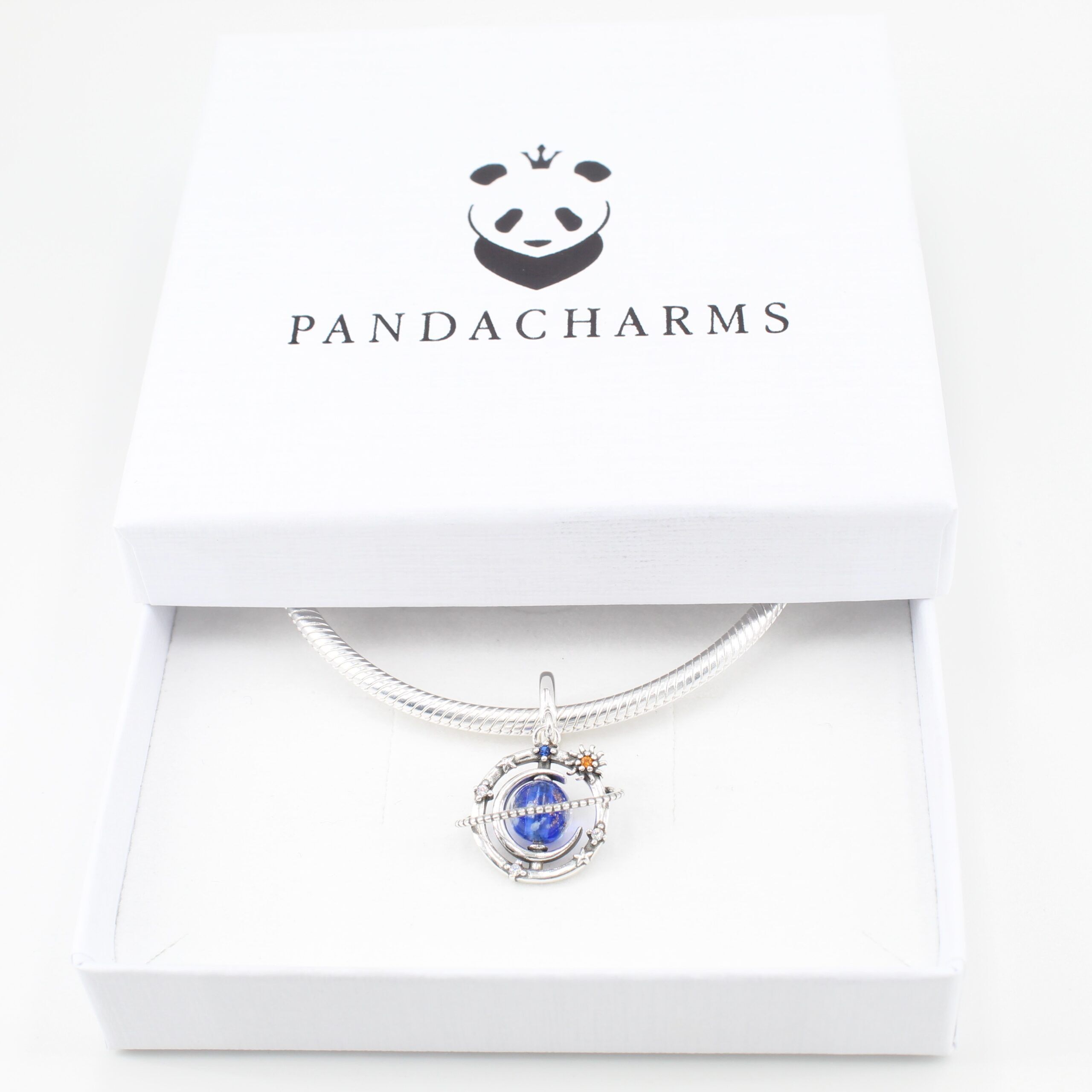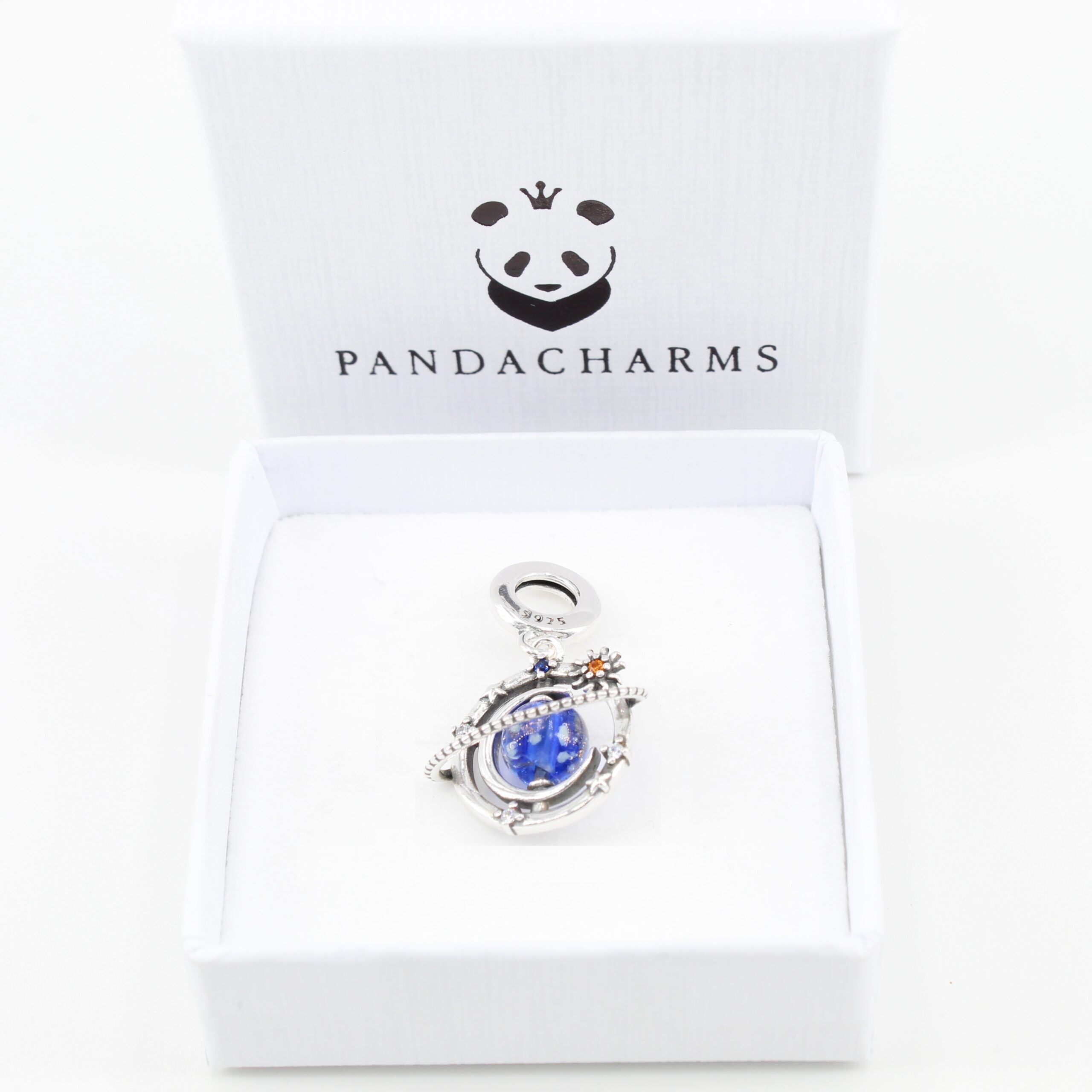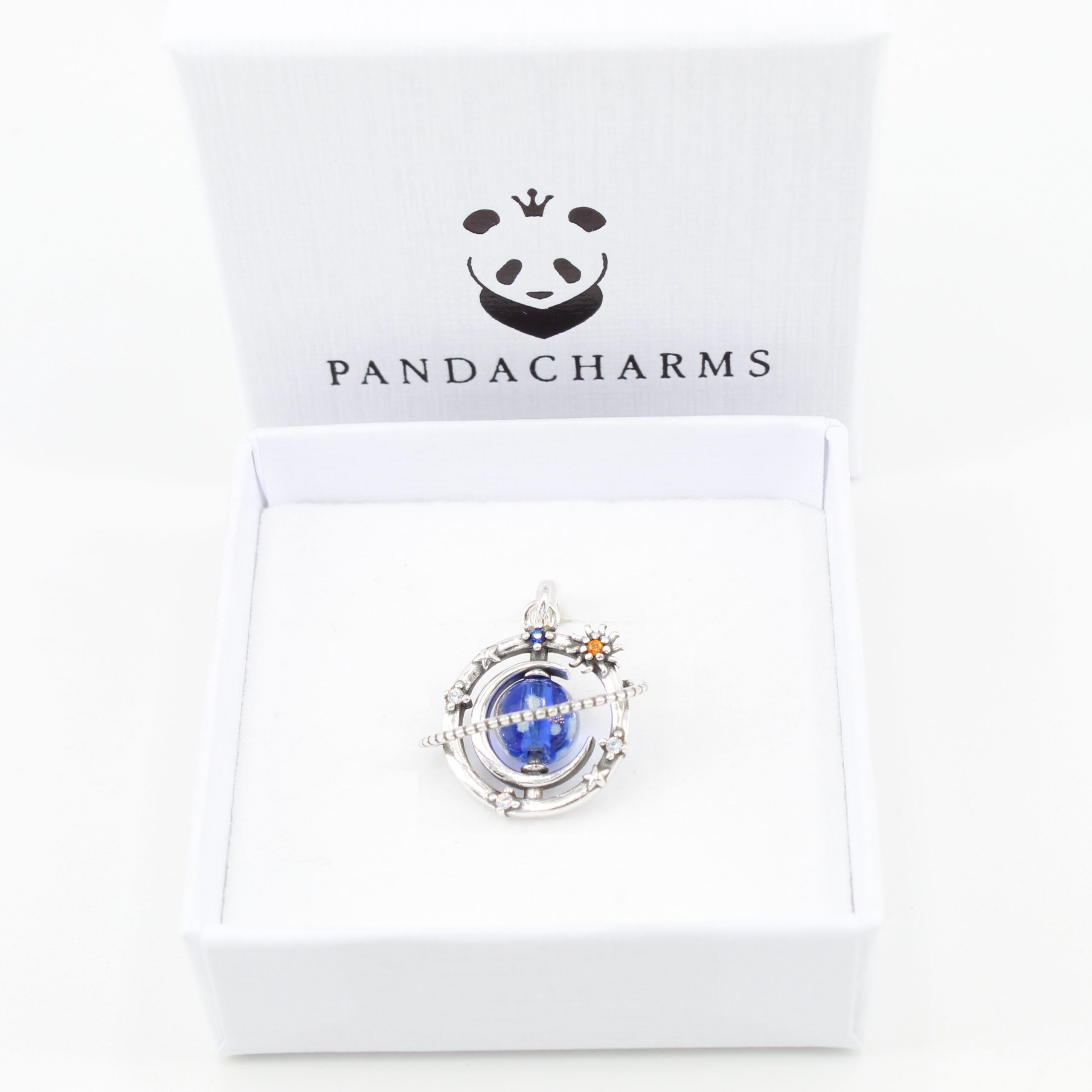 Eine kleine blaue Weltkugel aus Glas bildet das Zentrum dieses aufwändig gestalteten Anhängers, darum verlaufen drei Umlaufbahnen, teils besetzt mit kleinen Zirkonia Steinchen. Die Weltkugel ist drehbar, die äußere Umlaufbahn ist etwas nach außen gewölbt. Der Leuchtendes Universum Charm Anhänger ist beeindruckend und groß am Armband, er kann deswegen auch ganz alleine auf dem Armband getragen werden.