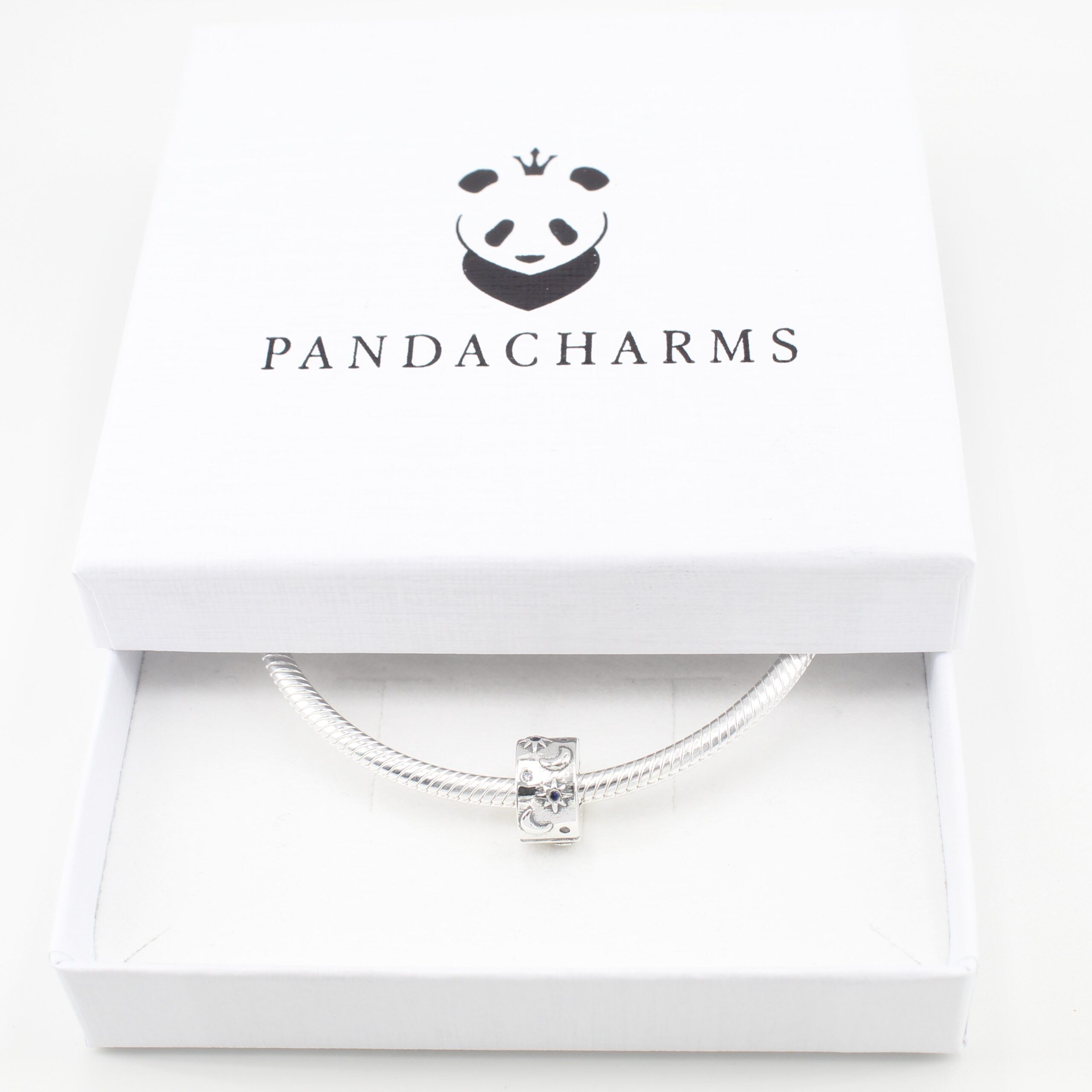Der Clip ist versehen mit Monden, Sternen mit blauen Zirkonia Steinen und weiteren einzelnen, weißen Zirkonia Steinen. Der Mond und Sterne Clip Charm passt sehr schön zu allen anderen Motiven des Sternenhimmels in silber, blau und gold.