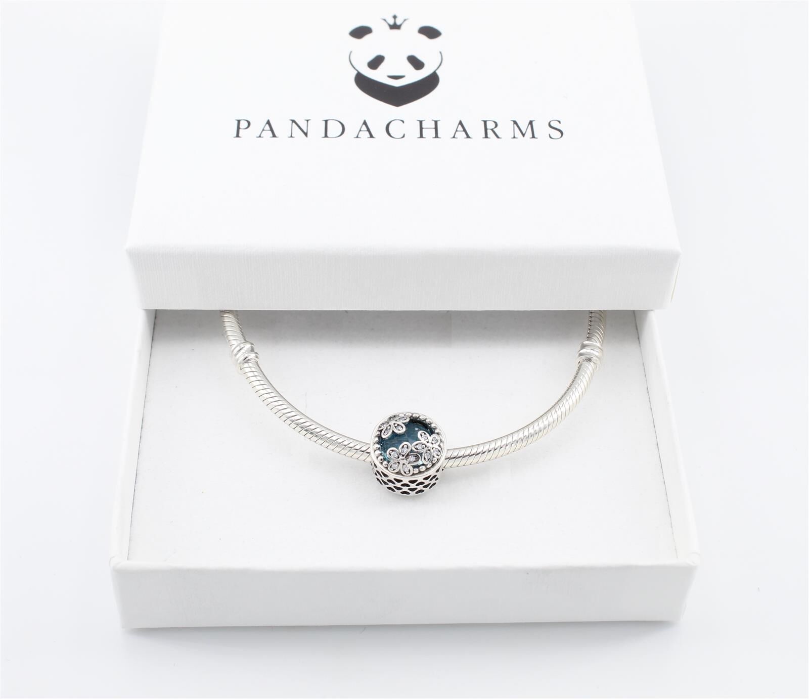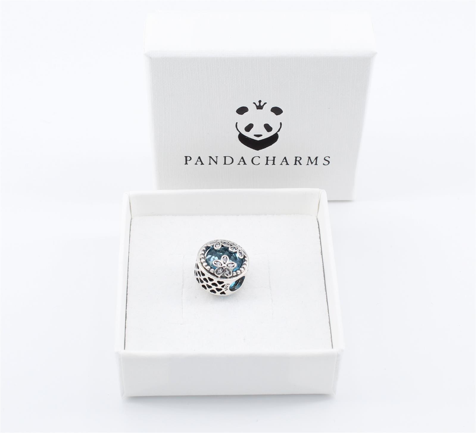 Innen das Blau der Unendlichkeit, außen umschlossen von feinem Sterling Silber und eingefasst mit weißen Steinen in Blumenform lädt dieser Charm ein zum Träumen bei Tag und bei Nacht. Träume mit und trage ihn immer bei Dir.