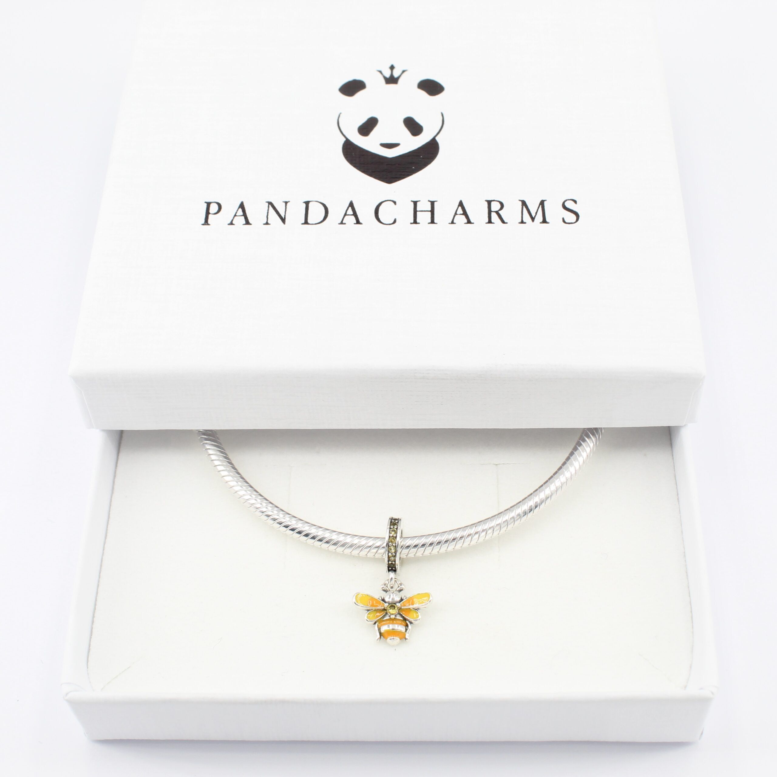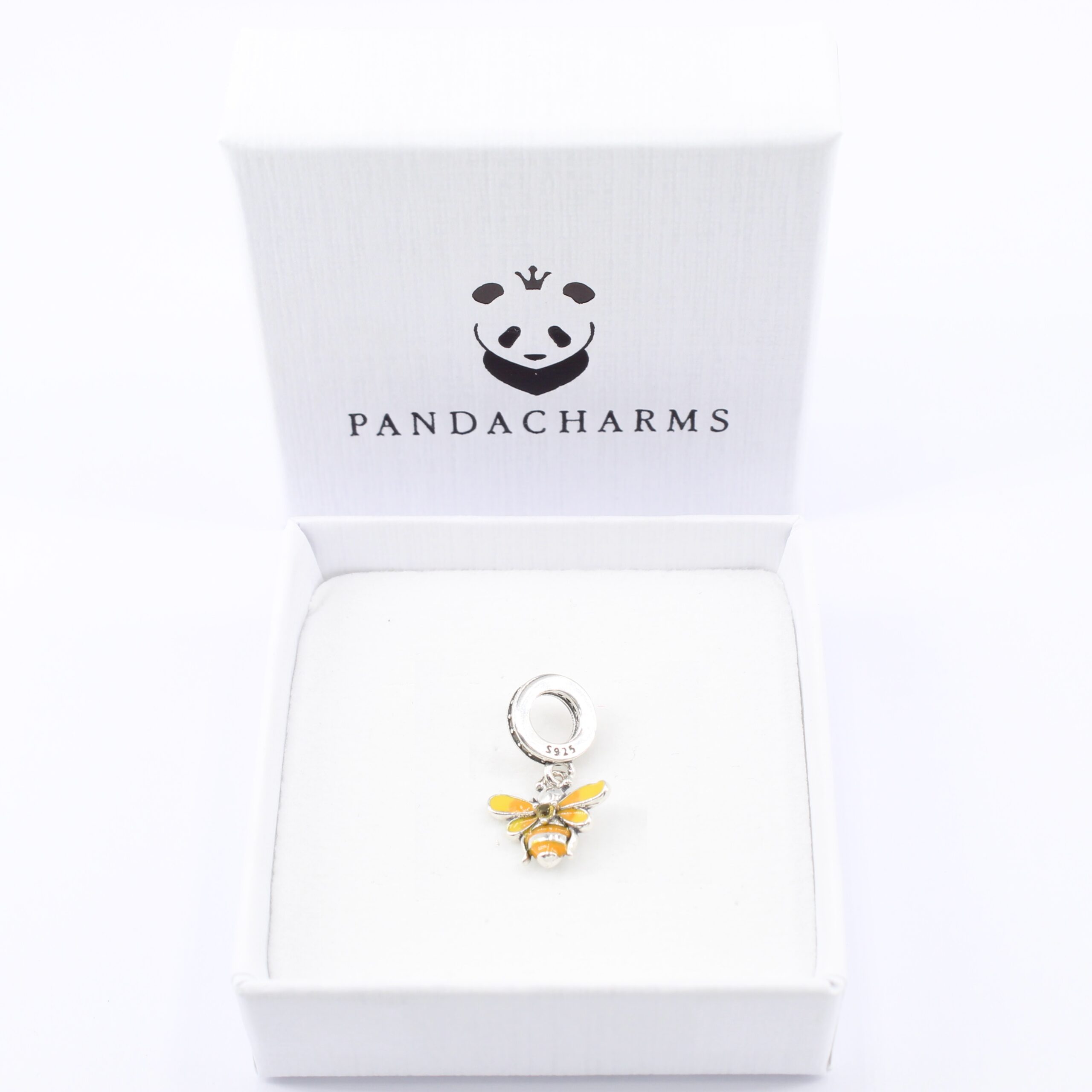 Eine Biene mit gelb-orange emaillierten Flügeln und gelben Zirkonia Steinen. Der Orange Biene Charm Anhänger ist wunderschön bunt anzuschauen und ein echter Hingucker auf jedem Armband! Der Anblick lässt an Sommerwiesen denken, an leckeren Honig und strahlenden Sonnenschein – ein echter Gute-Laune-Anhänger!