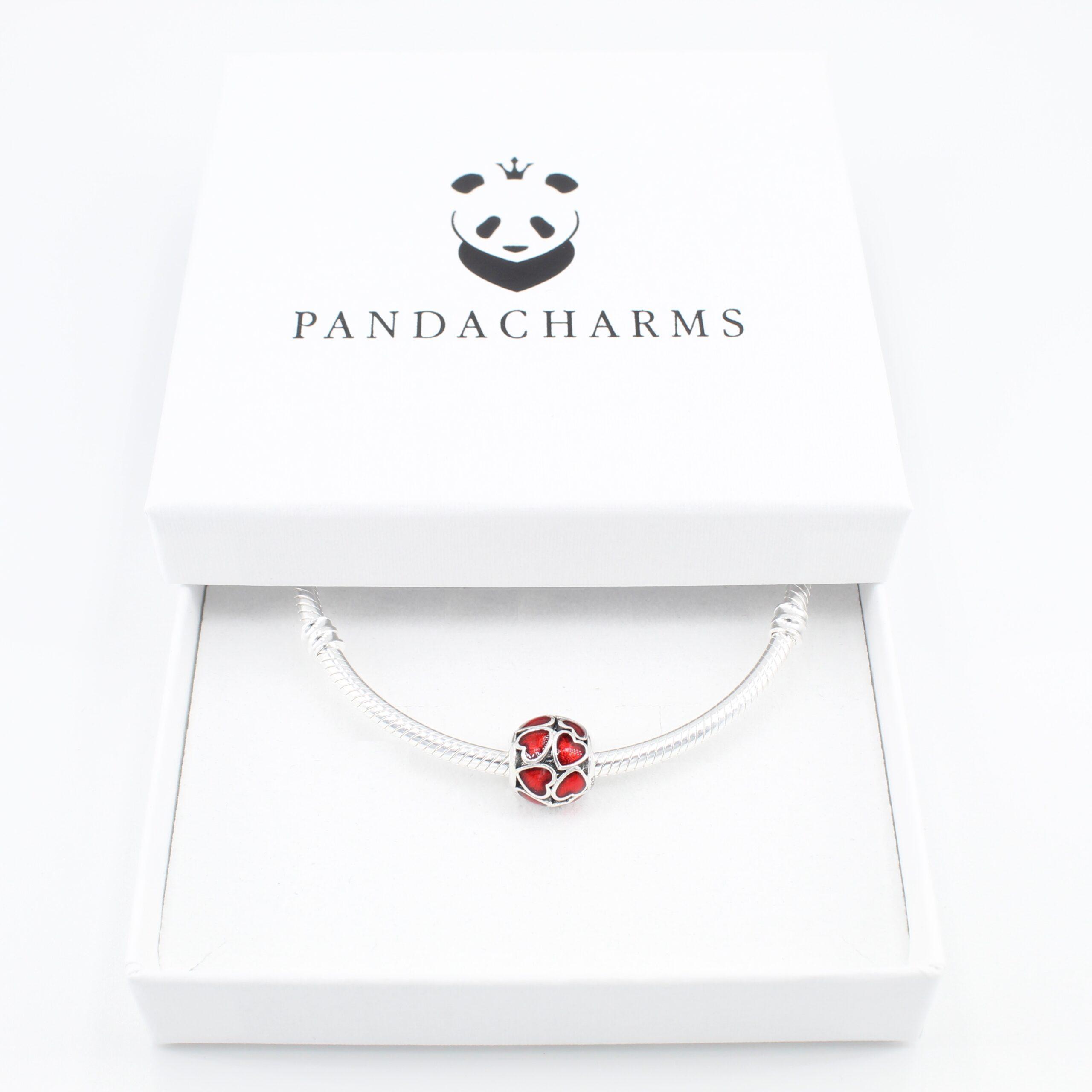 Rote Herzen rundherum. Das kräftige Rot sticht sofort heraus, die Herzen sind groß und auffällig, denn die Liebe muss man nicht verstecken sondern kann sie sehen lassen. Ein schöner Charm auch zum Verschenken und ein deutliches Zeichen zu setzen!