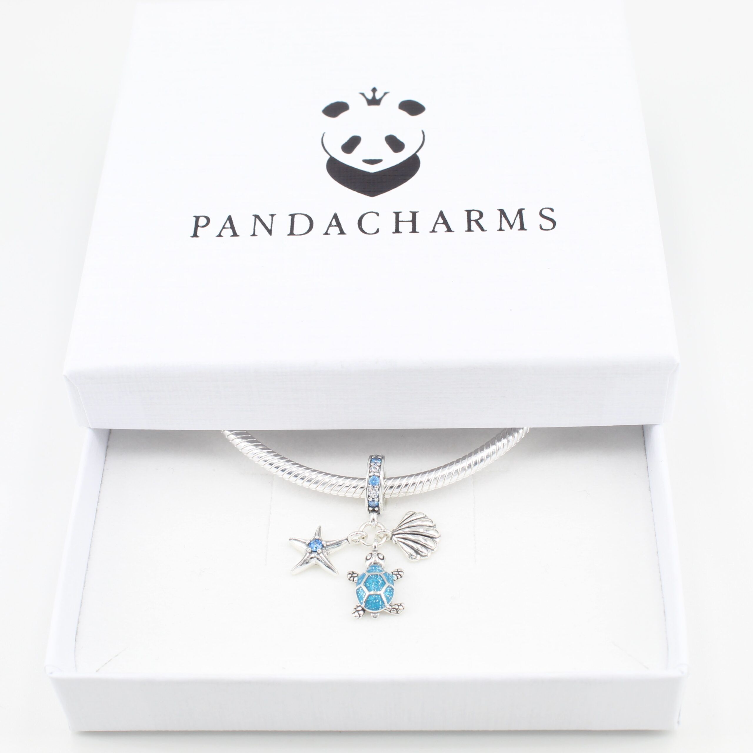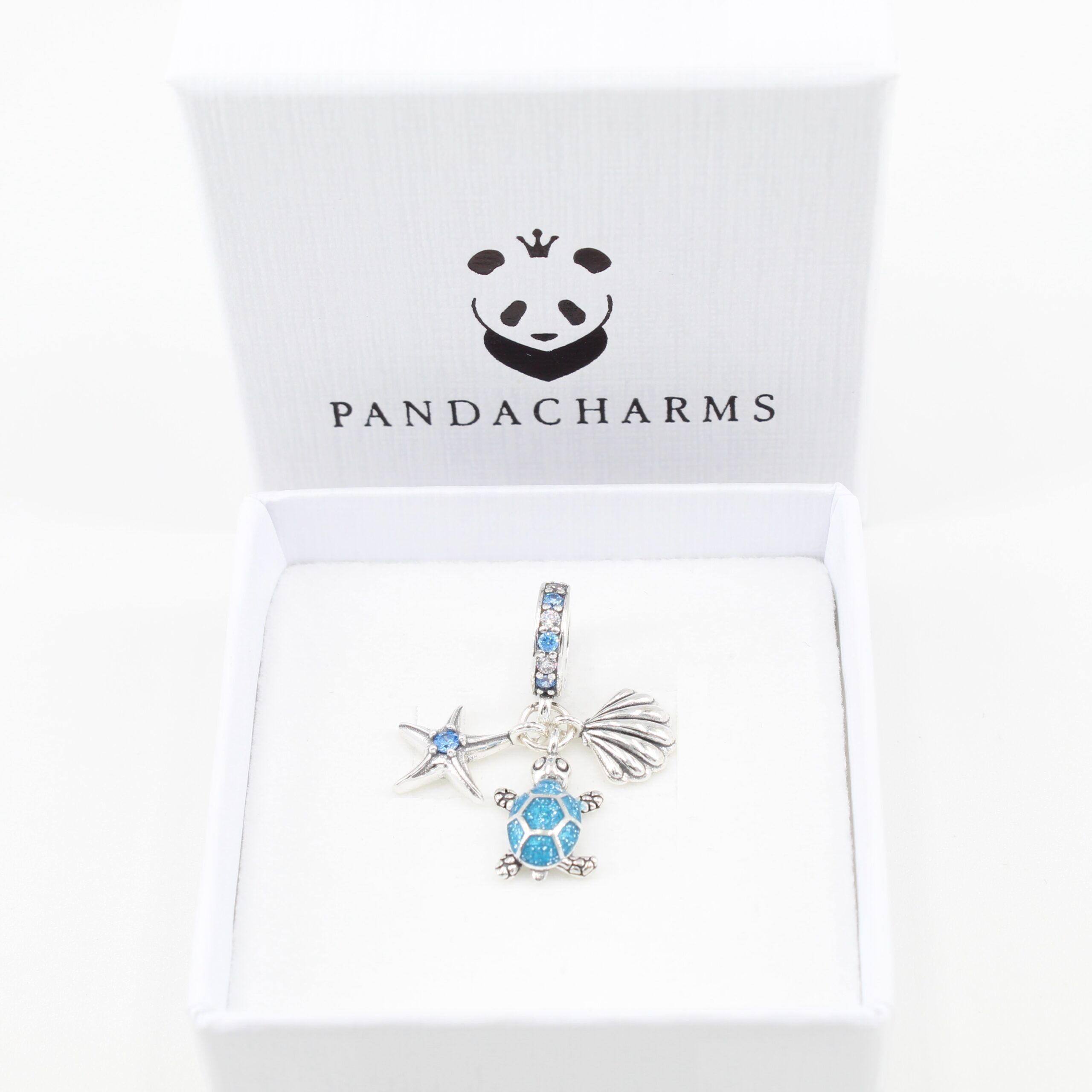 Ein zierlicher Anhänger mit einem Seestern mit blauem Zirkonia Stein, einer Schildkröte mit türkisfarbenem Panzer und einer silbernen Muschel. Der Ring des Anhängers ist mit zusätzlichen Zirkonia Steinen in türkis versehen. Der Seestern Schildkröte und Muschel Charm Anhänger ist beeindruckend in seiner Üppigkeit und passt sehr schön zu weiteren Motiven rund um Urlaub und Meer, dazu findest Du in unserem Sortiment noch einige schöne Sachen!